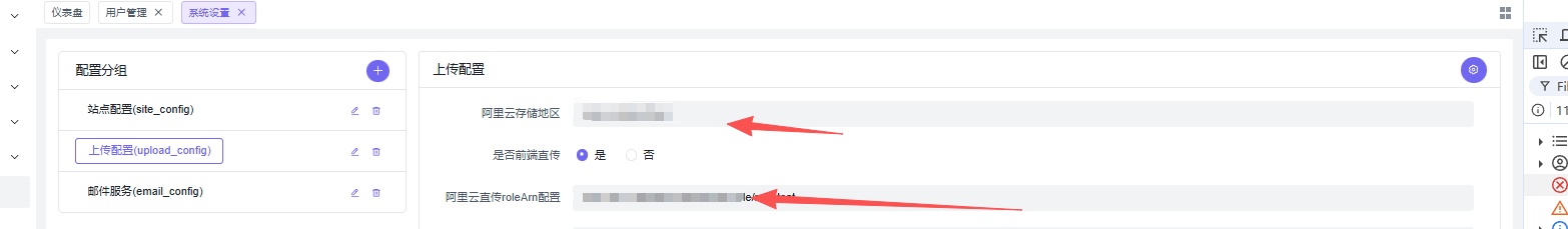 4、第四步,后上传配置里面额外添加oss_region存储桶位置和oss_role_arn字段把刚刚的arn配置填写进去,阿里endpoint的这个配置默认填写sts.cnhangzhou.aliyuncs.com即可,然后阿里云存储accessKeySecret和阿里云存储accessKeyId都需要填写子账户生成的不能用主账户的